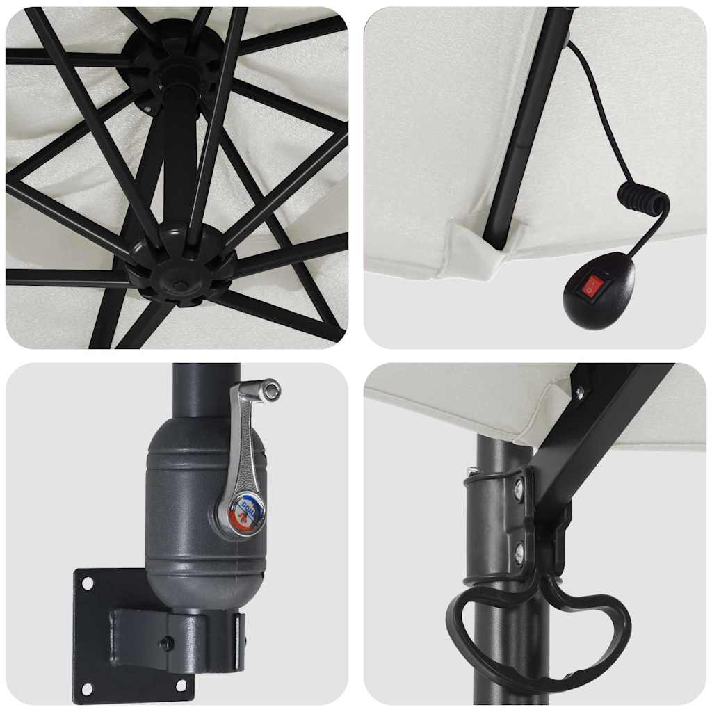 The Offset Outdoor Canopy is your go-to for slick shade, perfect for gardens and terraces. It mixes modern style with practical features, giving you a chilled and luxurious vibe. Its sleek round shape fits in beautifully wherever you place it, whether it's near some garden furniture or overlooking your lawn, making it an ideal spot for fun get-togethers or some quiet time to yourself. With its large, wraparound design, it stylishly protects you from the sun’s harsh rays, ensuring you stay comfy and chic. Sturdy Materials: Made from a polyester canopy paired with a strong metal framework, this canopy combines good looks with durability. The UV-resistant polyester keeps its bright colours while blocking out harmful rays. Instant Illumination: Fitted with LED strip lights, this setup turns your outdoor area into a lovely evening retreat. You can easily switch on the lights for nighttime gatherings without any hassle. Functional Design: Featuring a tiltable mechanism, this canopy can be angled just right for the best shade throughout the day. The simple manual adjustment makes it easy to match the sun's position. Versatile Usage: Perfect for patios, garden parties, or any outdoor bash. It brings joy and relaxation during the summer, making it ideal for sunny afternoons. Outdoor Care: Keep its good looks with minimal upkeep. It’s designed for outdoor use, making cleaning a piece of cake with little effort to keep it looking sharp.